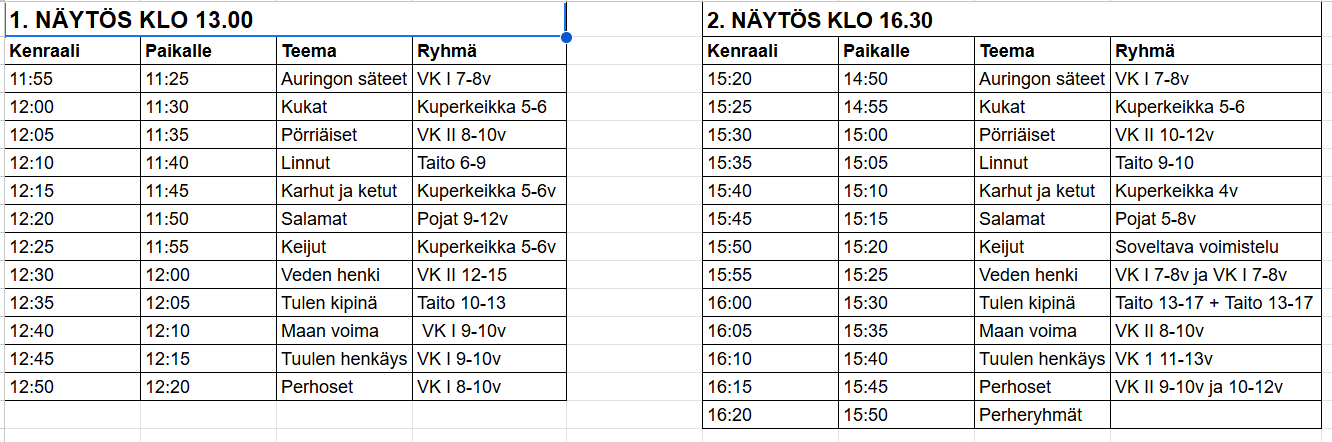 Ensimmäinen näytös alkaa klo 13.00 ja toinen näytös klo 16.30